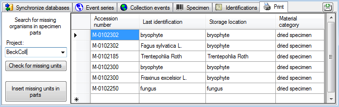 Select the print tab as well as the project and click on the [Check for missing units in parts] button. The missing entries will be listed as shown below. To insert them click on the corresponding button.