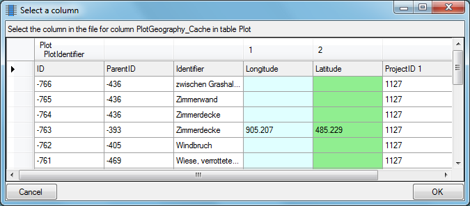 In the example shown below, the file columns Longitude, Latitude (resp. PlotGeography_Cache) were marked as decisive. Therefore only the two lines containing content in this columns will be imported.