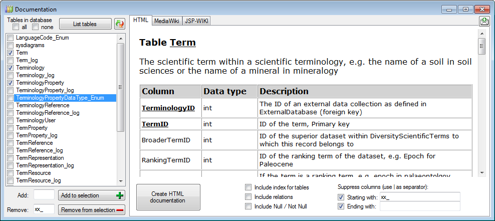 To configure your Database, choose Administration -> Database -> Documentation... to create documents of the table definitions (see below).