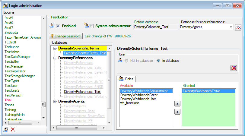 To administrate the logins on the database server, their permissions and roles respectively as well as access to projects choose Administration - Logins ... from the menu. A window will open as shown below.