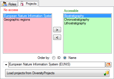 The access to terminologies can be administrated as projects where the projects correspond to the terminologies (see below). Use the > and < buttons to add or remove a terminoloy for the login.