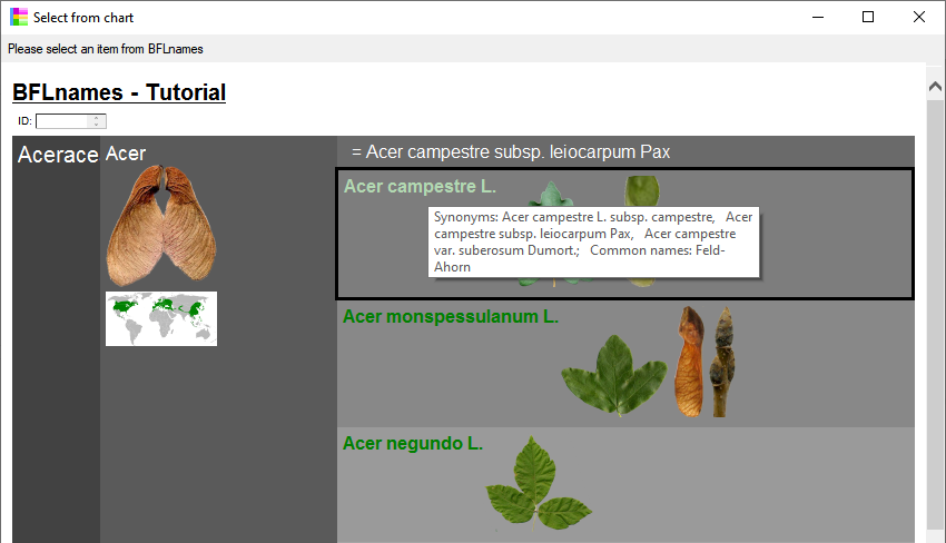 If there are checklists defined, you can choose either the whole database or a checklist. If you choose a checklist only the taxa within the checklist will be shown and the name of the checklist is shown in the header (see below).