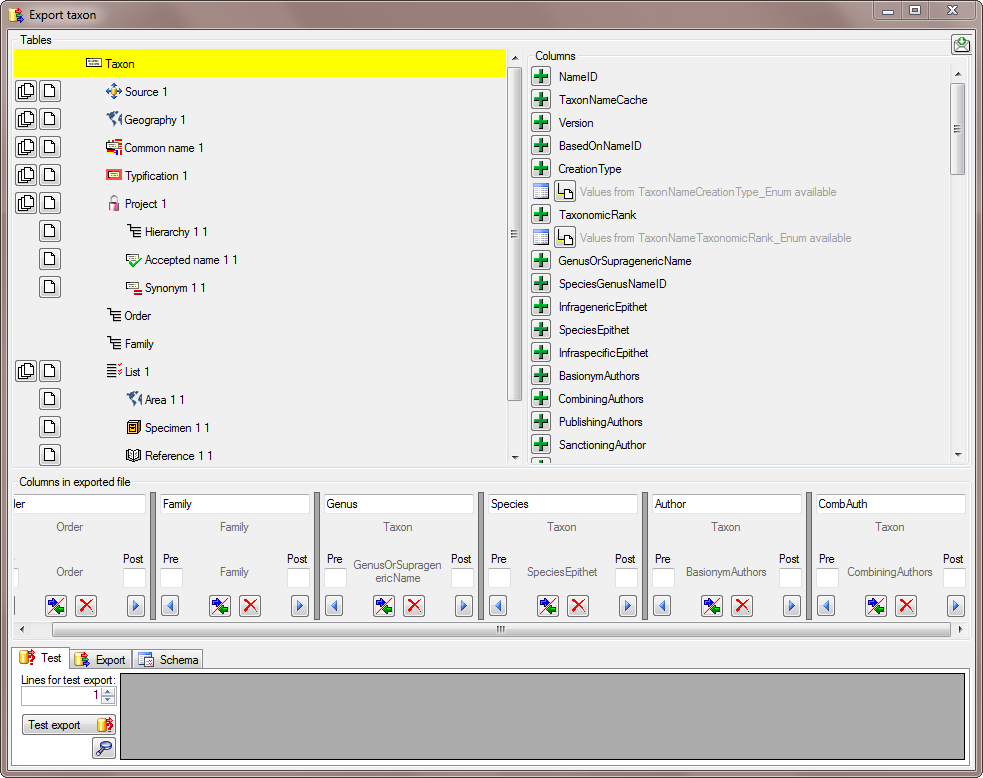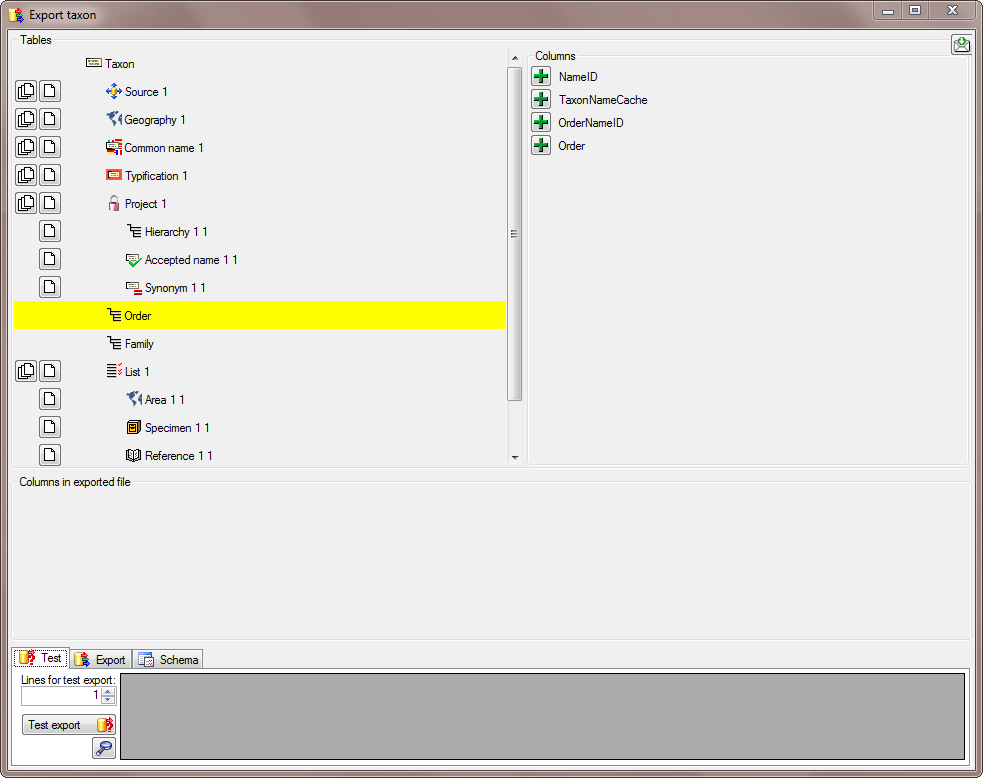 A window as shown below will open where the available tables for export are listed in the upper left area. To show the data colums of a table, select this table in the list.
