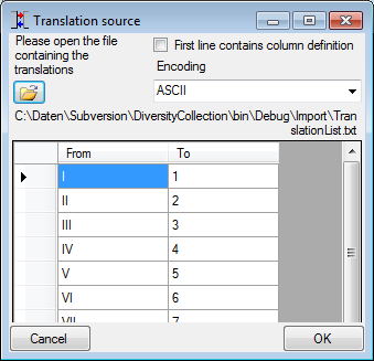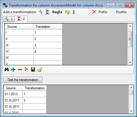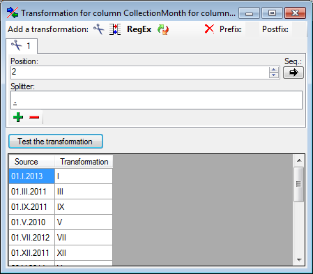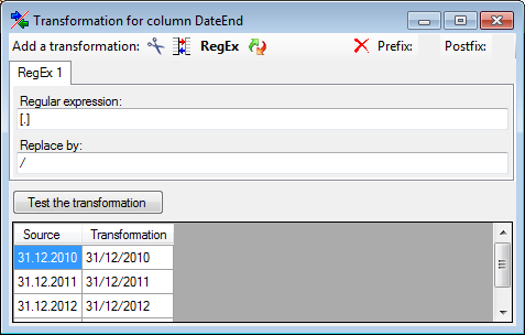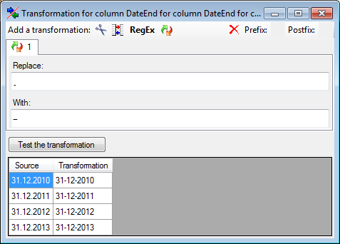 The replacement transformation replaces any text in the data by a text specified by the user. In the example shown below, the text "." is replaced by "-".