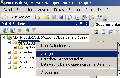 Start the Microsoft SQL Server Managment Studio and attach the database as shown below. Choose the node "databases" and right-click on it to open the context menu (see below). Then choose "attach" from the context menu. A window will open where you can choose the file DiversityTaxonNames_Data.MDF from your database directory and attach it to the database engine.