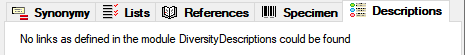 Corresponding to DiversityCollection as described above all DiversityDescriptions databases listed in the connections will be scanned for links to the selected name (see above). To see the details select the entry in the tree.