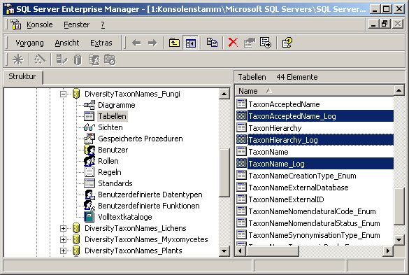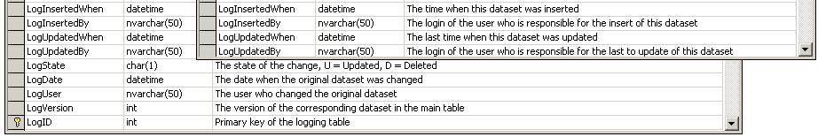 The logging tables (right side in image below) have the same structure as the data tables (left side in image below) and some additional fields (LogState, LogDate, LogUser, LogVersion and LogID) to document the logging as shown in the figure below.