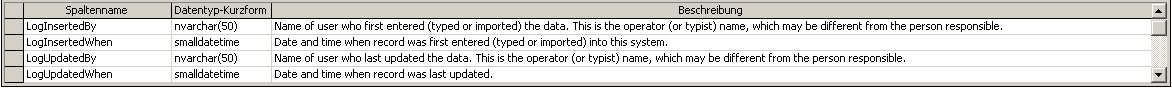 Changes within the database will be documented for each dataset with the time and the responsible user in the columns shown in the image below.