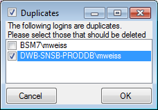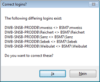 If logins with the same name but different server are found, one of them has to be deleted to make the correction possible. You will get a list where you can select those that should be removed.