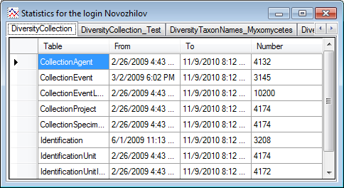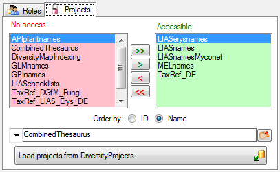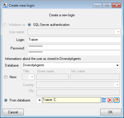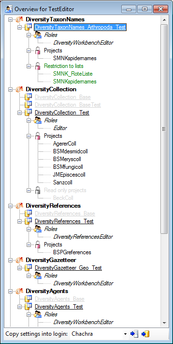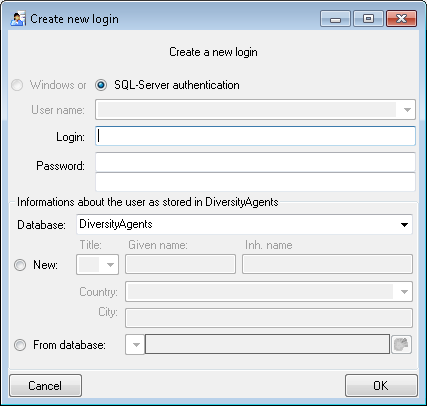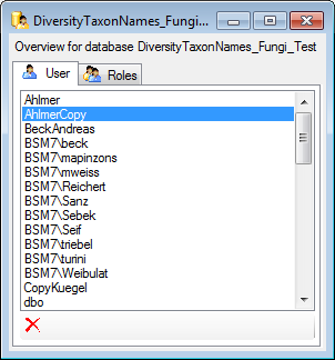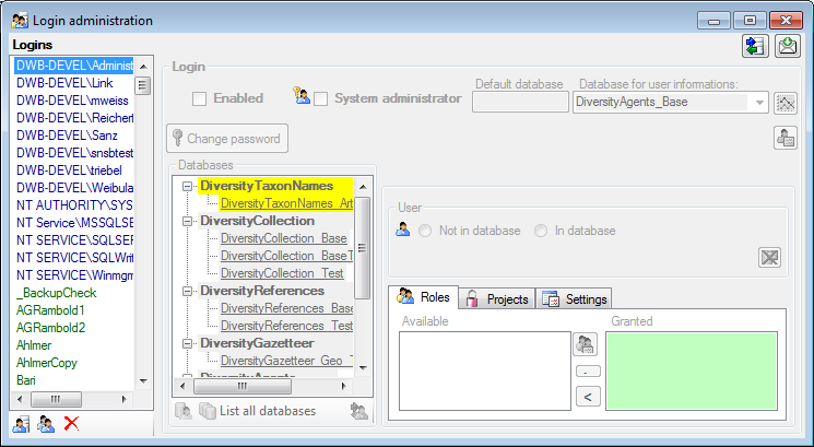 To administrate the logins on the database server, their permissions and roles respectively as well as access to projects choose Administration - Database - Logins ... from the menu. A window will open as shown below.