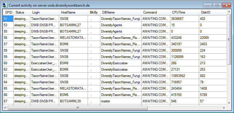 All databases on the server will be listed with the current database showing a yellow background. The databases where the login has no access will be listed in gray while the databases accessible for a login are black.