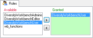 Use the > and < buttons to add or remove roles for the login in the database (see below).