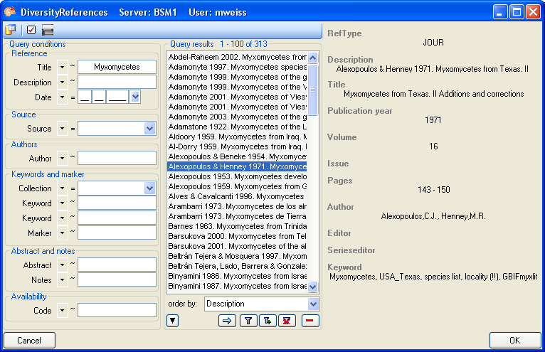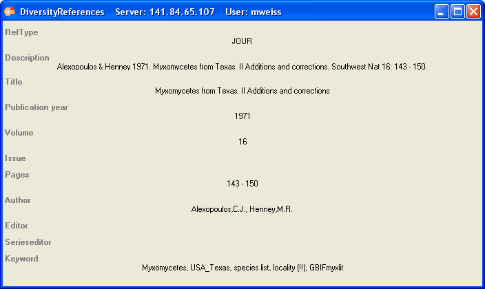 The Diversity Workbench is a set of components for building and managing biodiversity information, each of which focuses on a particular domain. Each module provides services for the other modules. To use the service of a module, you need access to the database of the module and optionally the module application placed in your application directory. Entries related to an external module have a standard interface in the main form. There are 2 states of this interface: