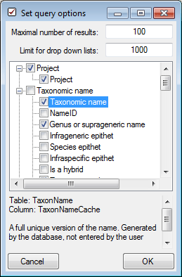 The limit for the creation of drop down lists is by default set to 1000. If you connect to a database, the programm will create drop down list based on the entries in the database to ease the entry in the query. For slow connections you may set this to lower value to speed up the start of the program. If you set the value to 0 no drop down lists will be created.