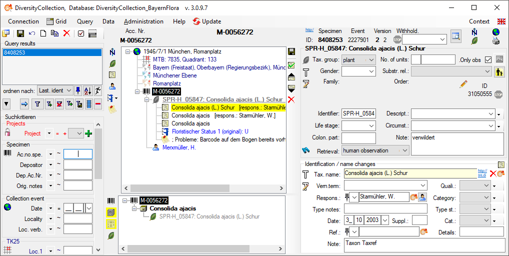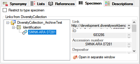 All DiversityCollection databases listed in the connections will be scanned for links to the selected name (see above). To see the details select the entry in the tree (see below).