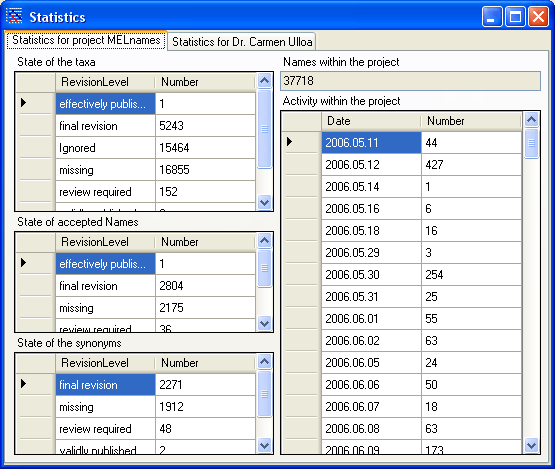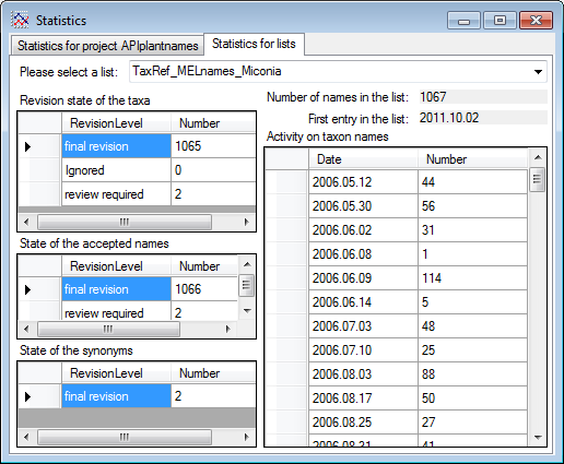 To see the activity and the state of revision within a project choose Help - Statistics ... from the menu. A form as shown below will open containing a summary of the project, for the current user and for lists.