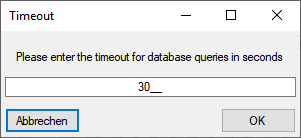 To set the timeout for queries in the database, select Connection - Timeout for database... from the menu. In the window as shown below enter the timeout in seconds. The default value is 30 seconds. A value of 0 means infinite.