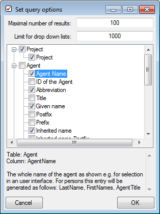 The limit for the creation of drop down lists is by default set to 1000. If you connect to a database, the programm will create drop down list based on the entries in the database to ease the entry in the query. For slow connections you may set this to lower value to speed up the start of the program. If you set the value to 0 no drop down lists will be created.