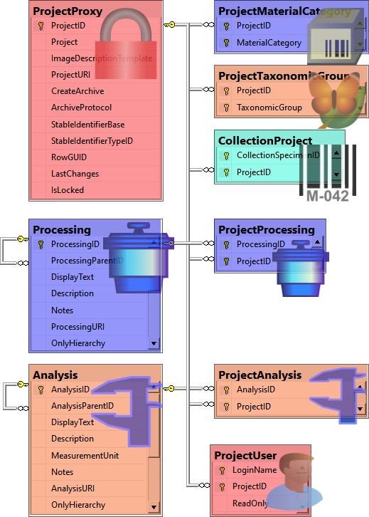 The user's access to the data within the database is stored in the tables shown below. The tables UserProxy and ProjectProxy are related to the Diversity Workbench modules DiversityUsers and DiversityProjects respectively. See User administration for further details.