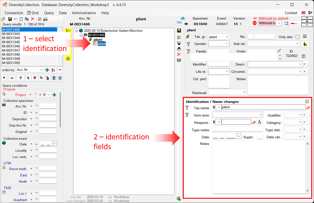 - To view or enter the details of the identification entry, such as taxon name, etc., select the identification entry in the tree (see points 1 and 2 in the image below), and then follow the next section Add details to the identification.