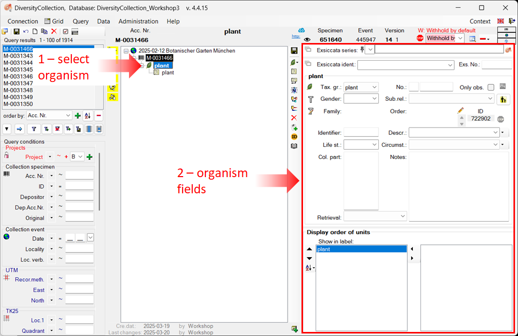 To view or enter the details of the organism, select the organism entry in the tree (see points 1 and 2 in the image below).