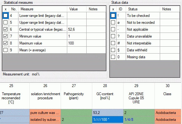 If you checked the option Separate quantitative measures, for each statistical measure in the quantitative summary data a separate column will be allocated in the data grid view. I.e. you can direcly enter your values into the table (see image below).
