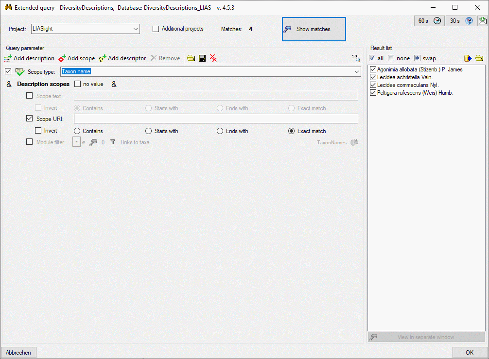 If you entered more than one condition, the default adjustment is that all conditions must match. This is indicated by the symbol behind the text Description scopes and the no value check box, which means “logical AND”. If you want to get a match for any of the entered conditions, you may click on the symbol to change it to “logical OR”.