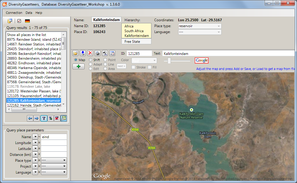 The entries consist of name ID, name, place type and coordinates (if any). If no coordinates are available, the entry is shown in gray. In case the entry describes a complex geography (e.g. a country polygon, a river line string etc.), the coordinates represent the “envelope center” of the shape.